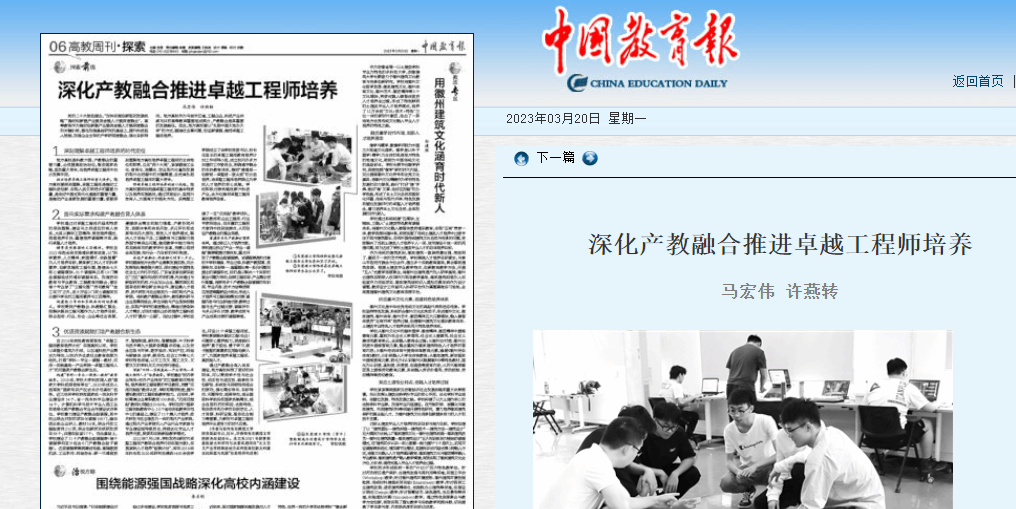 3月20日,马宏伟校长等在《中国教育报》高教周刊第06版发表署名文章《深化产教融合推进卓越工程师培养》,全文如下: