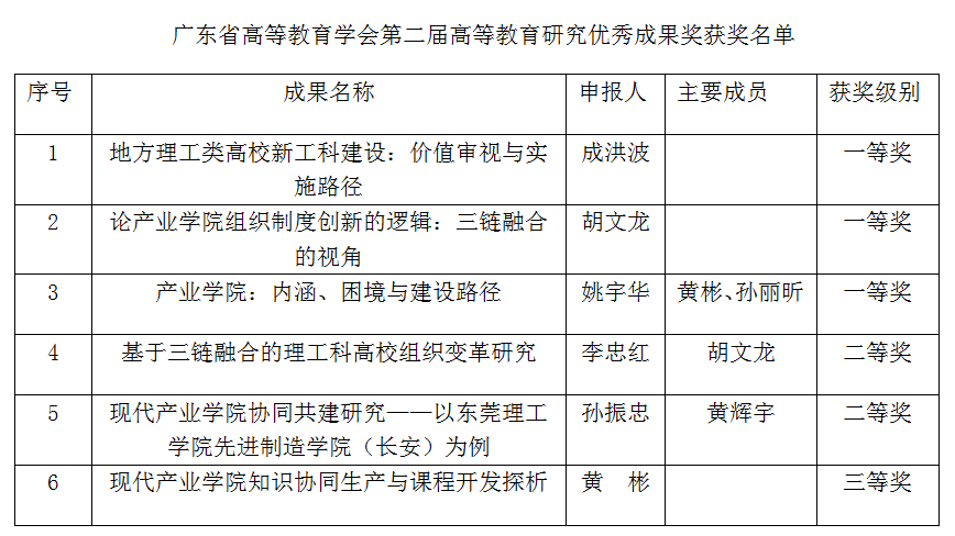 近日,广东省高等教育学会公布第二届高等教育研究优秀成果奖评选结果。我校获得佳绩,共有6项成果获奖。其中一等奖3项、二等奖2项目、三等奖1项。为扎实做好本次优秀成果奖申报工作,在学校主要领导的亲自推动和大力指导下,由高教所统一组织,制定了申报工作方案,经个人申报、二级组织机构推荐和专家评审,向学会择优推荐了8项成果。