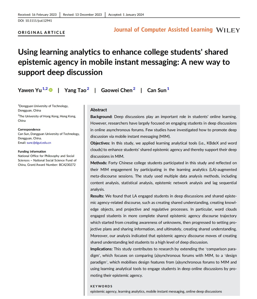 近日,我所于雅文博士在国际学习科学权威刊物《Journal of Computer-Assisted Learning》上发表题为“Using learning analytics to enhance college students' shared epistemic agency in mobile instant messaging: A new way to support deep discussion”的学术论文。该研究探索了利用学习分析工具及反思型课堂对话支持激发学生认知主动性,进而提升学生的深度讨论能力。