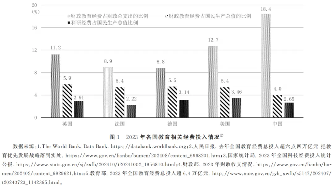 其一,教育和科研经费投入有待进一步提升。2023年我国财政性教育经费占国民生产总值的比例为4.0%,科研经费占国民生产总值的比例为2.65%,虽科研经费的国民生产总值占比略高于法国(2.22%),但与世界重要教育中心的整体投入水平仍存在一定差距,未来我国仍需持续扩大教育与科研经费投入规模。