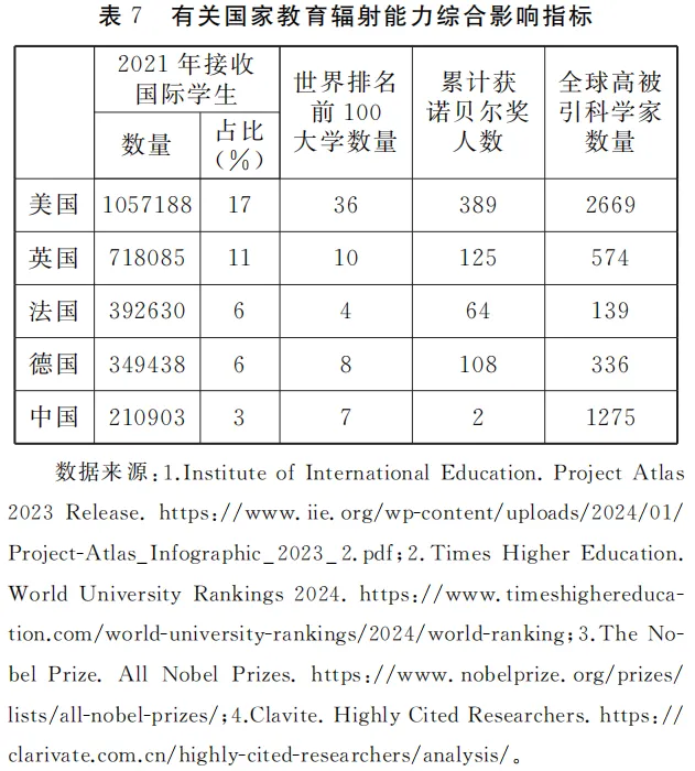 在综合影响层面,主要考察一国教育现阶段取得的成效及其在世界范围内的影响力,共涵盖“学生参加国际学生评估项目(PISA)的成绩排名”、“世界排名前100的大学数量”、“接收国际学生数量和占比”、“累计获诺贝尔奖人数”④、“全球高被引科学家数量”五个二级指标,分别用于考察一国基础教育质量与跨国吸引力、大学办学质量与国际声誉、全球知识创新发展的引领力、高等教育体系的国际吸引力等方面的情况,从而综合反映一国教育、科研、人才培养的成效及其全球范围的影响力。