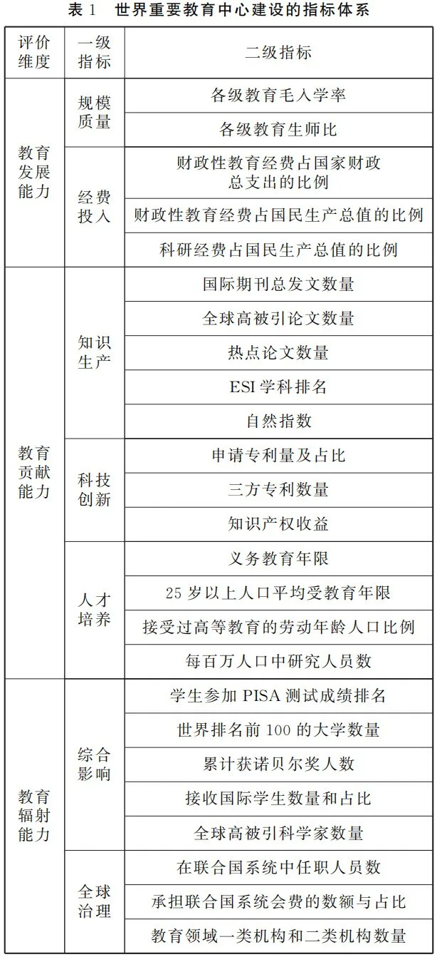 整体而言,有关世界重要教育中心的研究呈现愈来愈丰富的趋势,但既有研究在分析这一议题时更多焦距于世界重要教育中心的形成与转移过程,在揭示世界重要教育中心的核心内涵方面存在不足,同时缺乏相应的评价指标体系来衡量世界重要教育中心的建设,进而明确我国世界重要教育中心建设的国际方位、已有基础与存在的差距。基于此,本研究旨在通过辨析世界重要教育中心的核心内涵与本质特征来构建相应的评价指标体系,并以英、法、德、美为参照系进行国际比较,从而研判我国教育发展较之世界重要教育中心所处的方位以及存在的优势与不足,为今后推进我国世界重要教育中心建设提供有益参考。