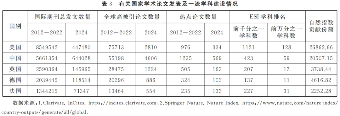 从共时视角来看,我国知识创新的加速发展更为明显。InCites平台发布的数据显示,在2024年⑧,我国学者在国际期刊中的论文发表量为644028篇,高引用论文数量4606篇,热点论文数量569篇,均超过美国,位于世界第一位。[31]以上数据反映了近年来我国以高校为代表的科研组织的国际影响力逐步扩大,我国学者逐渐走向国际学术舞台的中央,与全球学者展开密切合作与对话;我国科技创新开始从“跟跑”向“并行”转变,甚至在部分领域处于“领跑”位置,实现了质量与规模的双重提升。
