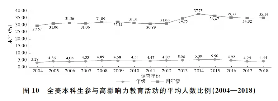 高影响力教育活动主要指学生在课堂教学之外参与的、对其成长发展有重要价值的一系列教育实践活动。自2004年以来,全美本科生参与高影响力教育活动的平均人数比例稳定在四年级34%和一年级4.5%左右。2018年,在四年级本科生中,有49%参加了实习实践、社会调查等活动,23%与教师一起共同开展研究课题,45%完成了一次顶点课程,14%曾经或正在参与海外学习项目;在一年级本科生中,已经参与过上述四项活动的学生虽然比例不到5%,但是却有高达77%的学生计划参与实习实践、社会调查活动,34%的学生准备与教师开展研究工作,55%的学生即将参与顶点课程,41%的学生期望前往海外留学。(见图10)