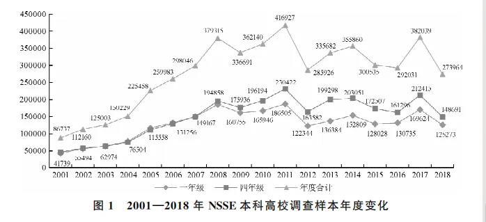 NSSE项目每年对参与院校的一年级和四年级学生开展随机抽样调查。本文采用了NSSE项目2001—2018年的本科院校调查数据。该数据集以卡内基高校分类为依据,包含当年各类参与院校一年级和四年级学生的调查情况。在18年中,每年参与项目的全美本科高校数量在300所到800所之间,每年度学生总样本在8万至42万之间。一年级本科学生总样本为2 295 552个,四年级本科学生总样本为2 683 174个(见图1),涵盖了不同专业、不同性别和族群的学生。