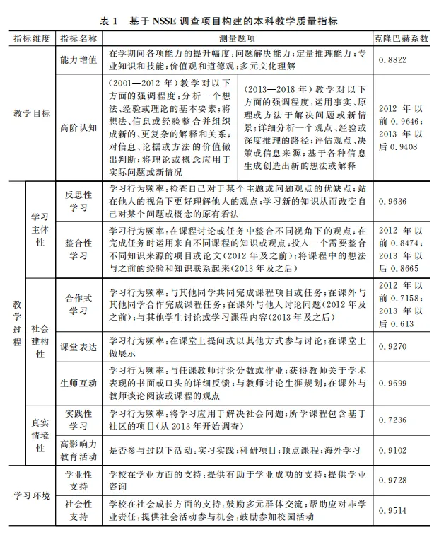 NSSE调查聚焦大学生在课程教学、课外教育活动、学校生活等方面的体验,“所有问题的设计都与提高教学质量存在一定关系”,使学校管理者可以通过调查结果发现指导教学工作。[35]自2000年推动全国性调查以来,NSSE的问卷指标和题项经历了不断完善的过程。2013年NSSE项目顺应美国新时期高校教改的趋势,将问卷指标体系从“五大可比指标”转变为“十个主题”,但大部分题项仍保持一致性。问卷中有9道大题37个小题涉及课程教学活动。本文根据上述美国高校“学生中心”教学理论视角,整合NSSE项目原有的教学质量指标,从三个维度展开分析。一是教学目标维度,包含学生能力增值和课堂高阶认知训练。二是教学过程维度,包含反映学习主体性的反思性学习和整合性学习,反映社会建构性的合作式学习、生师互动和课堂表达,反映真实情境性的实践性学习和高影响力教育活动。三是学习环境维度,包含学生所感知的学业性和社会性成长支持水平。各指标均采用NSSE问卷的题项进行构建和验证(见表1)。问卷采用四点量表,在分析中转换为百分制。2013年前后,各指标包含题项的变动幅度较小,只有“高阶认知”指标凸显了“创造”思维作为课程教学目标的重要性。