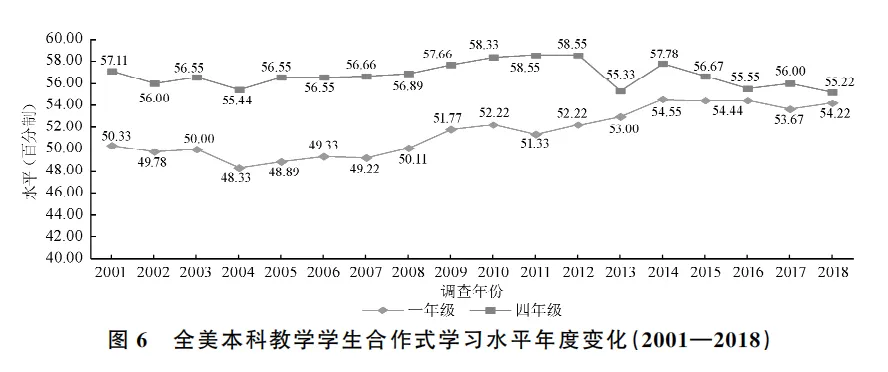 合作式学习反映学生积极与他人共同学习课程内容,在互动中建构知识体系的过程。2001年以来,全美四年级本科生的合作学习水平相对稳定在56分上下;一年级的得分均值自50分显著提升至54分以上(Bonferroni检验:2018>2001,P<0.001)。2018年,超过50%的一年级学生和超过60%的四年级学生表示经常与同学一起讨论课程内容、完成学业任务。由于一年级学生合作式学习水平快速提升,2018年一、四年级之间已无显著差异。(见图6)