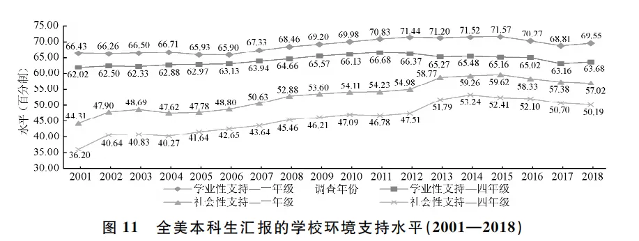支持性环境反映学校为本科生学业进步和社会性成长提供的各项条件。2001—2018年,全美一年级本科生感知的学业支持水平由66分显著提升至69分以上,四年级本科生感知的学业支持水平稳定在63分上下(Bonferroni检验:一年级,2018>2001,P<0.05;四年级,2018=2001,P>0.05)。2018年,分别有76%、70%的一、四年级本科生认为学校为学生学习成长提供了较多支持;78%、66%的一、四年级本科生认为学校为学生提供了较多的写作训练辅导。