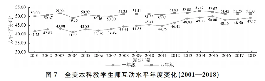 本科教学中教师给予及时反馈、帮助学生构建学习意义是促进学生发展的重要途径。2001年以来,全美四年级本科生与教师互动的水平稳定在50分上下;但一年级的互动水平自41分显著提升到49分以上(Bonferroni检验:2018>2001,P<0.001)。2001年,分别有27%、15%的一年级学生表示经常与教师讨论职业生涯规划或学术观点,到2018年,这两个比例分别上升到37%和27%。说明一年级的生师互动情况持续改善。从年级差异来看,四年级生师互动水平总体上好于一年级本科生(2018年,T= 2.2459,p<0.05),但差距在逐渐缩小(见图7)。