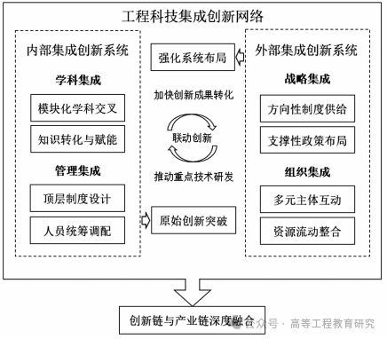 集成创新思想源于经济学家约瑟夫·熊彼特(Joseph Alois Schumpeter),强调“组合”在生产和创新中的作用,认为“生产就是将人力所及的物质和自然力量组合起来”。[7] 随后,弗里斯托弗·弗里曼(Christopher Freeman)从经济学角度,将创新视为“综合引进新产品、新流程和新系统,进行商业性转化”[8],体现了创新集成性和动态性。1994年马可·依恩斯蒂(Macro Iansiti)等首次提出“技术集成”概念,区分了内部集成与外部集成。内部集成侧重解决自身问题,强调组织内部知识或技术子单元之间匹配与协调,涉及专门技能、知识基础和技术及管理系统;外部集成注重跨越组织边界与外部环境进行互动和整合。[9] 内外部技术集成不是多个子技术的简单重组,而是以实现生产为目标,对各技术要素不断改组和重构,协调要素结构与生产过程间的适配度,实现内外部要素的系统性耦合。随后,国内外集成创新研究逐渐由技术层面集成拓展至知识、学科和管理层面,逐渐运用至工程专业领域。
